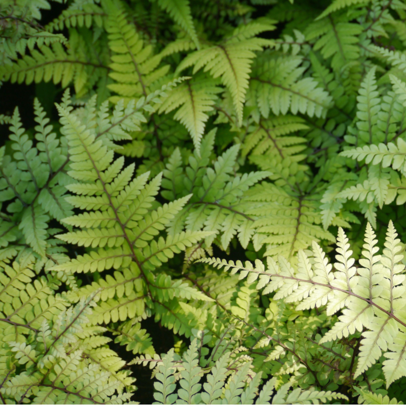 A prize-winning fern whose fronds emerge lime-green and gradually darken to a deeper green, creating a dramatic two-tone effect. Maroon-purple stems complement the pretty picture.