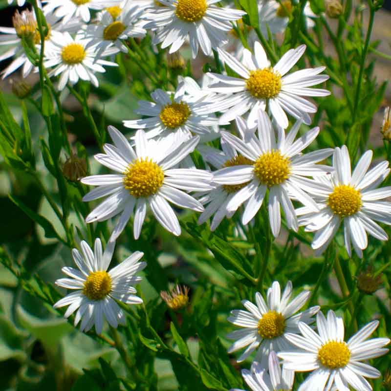 A Japanese aster that’s perfect for first-time gardeners or anyone who wants an easy-care, reliable, long-blooming plant in the sunny, summer garden. One-inch, daisy-like flowers with yellow centers virtually blanket the tidy, compact mounds of dark green leaves.