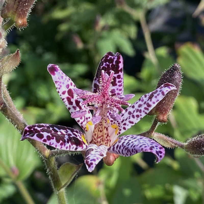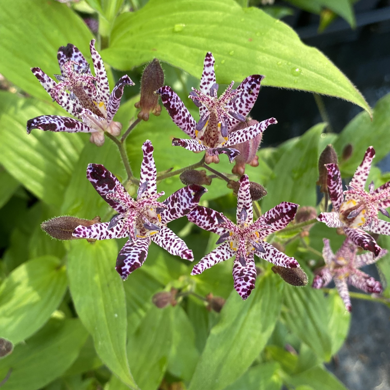Striking violet buds open to reveal elegant creamy white, orchid-like flowers with ruby-purple spotting. These ravishing flowers are long-blooming and add a touch of the exotic to the fall season. The deep green foliage is clean and holds up well even in hot, humid summers.